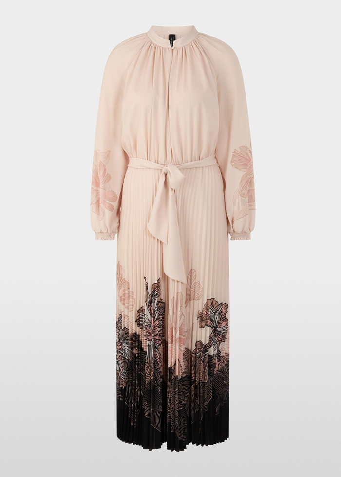 Raštuota suknelė ilgomis rankovėmis ir stačiu kaklu.