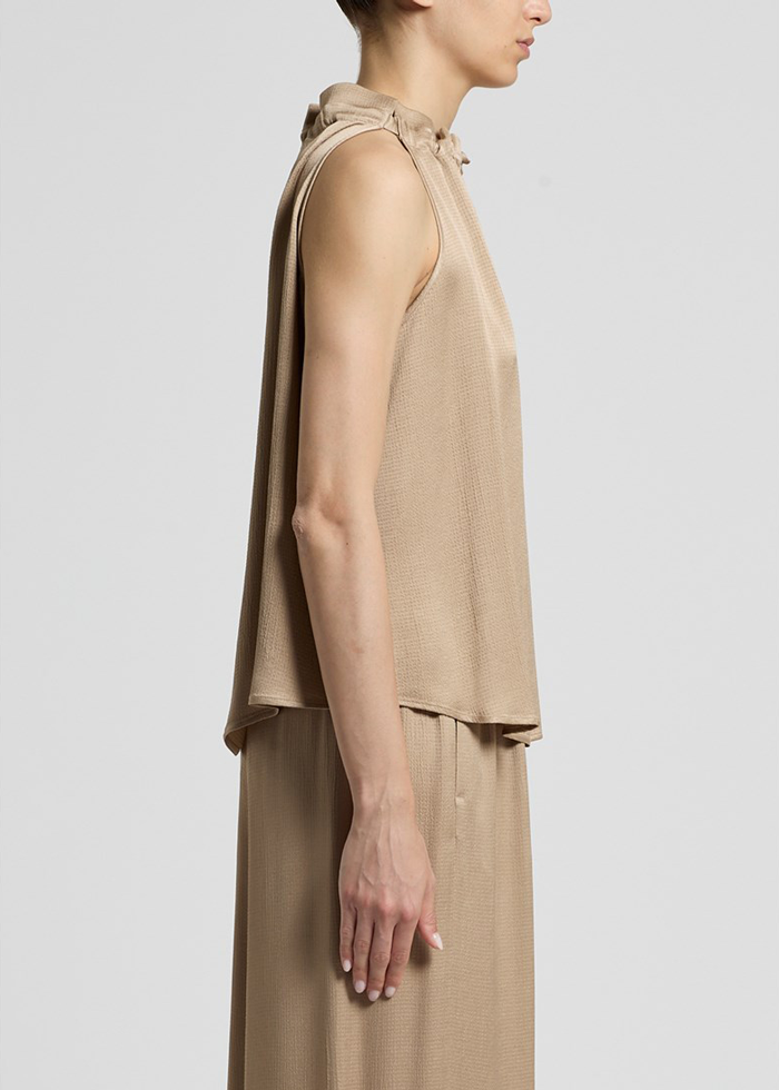 Violetinės spalvos prigludę viskoziniai satininiai marškiniai ilgomis rankovėmis. Susagstomi sagutėmis piekyje. Klasikinė apykaklė. Surauktas juosmuo. Prailgintos užsegamos rankovės.