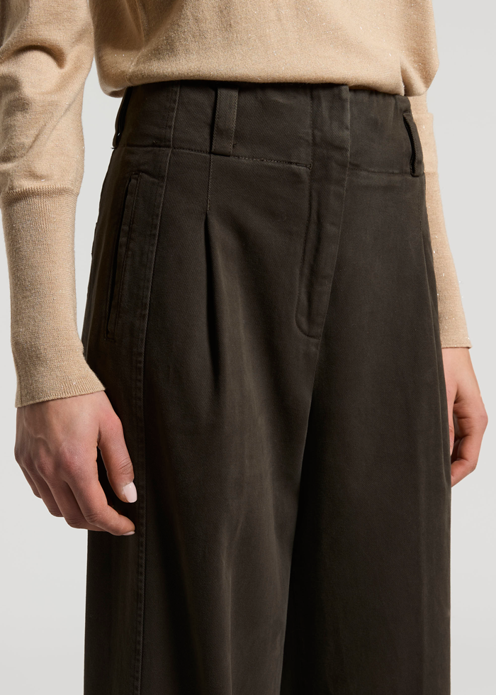 Tamsios spalvos plataus tiesaus silueto kelnės. Aukštas juosmuo. Kilpos diržui. Kišenės.