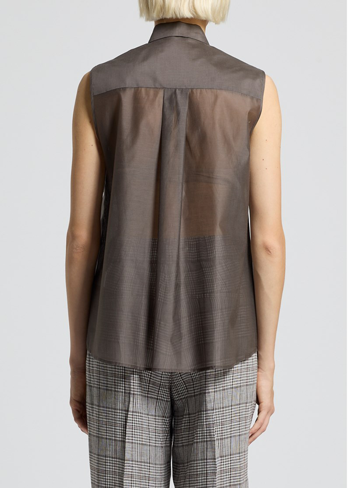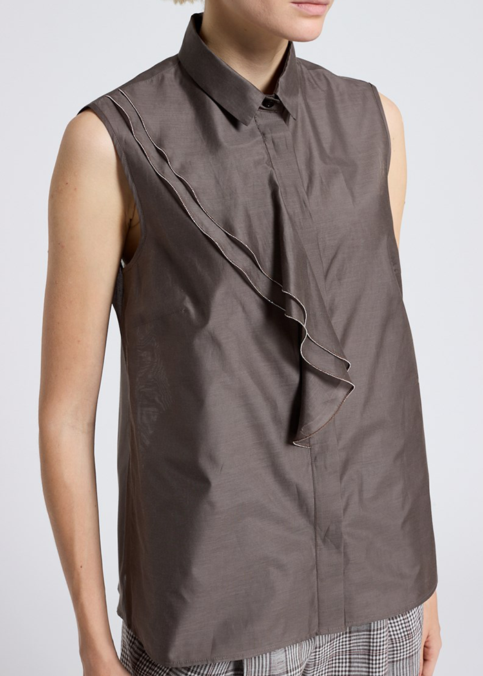 Tamsiai rudos spalvos elegantiška prabangi palaidinė be rankovių. Paslėpta sagų juosta. Dekoruota detale.