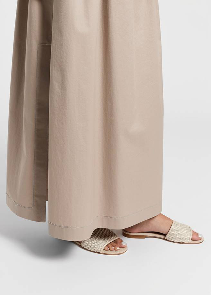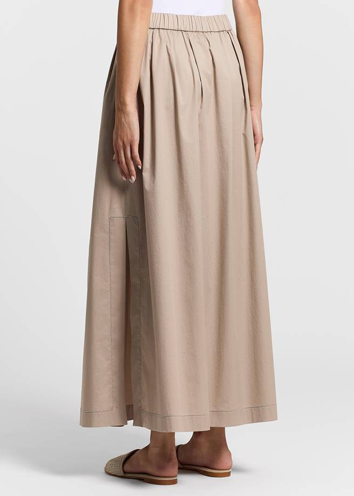 Smėlio spalvos maksi ilgio elegantiškas sijonas. Vidutinis elastinis juosmuo. Gilus skeltas. Dekoruotas prabangia blizgia juostele.
