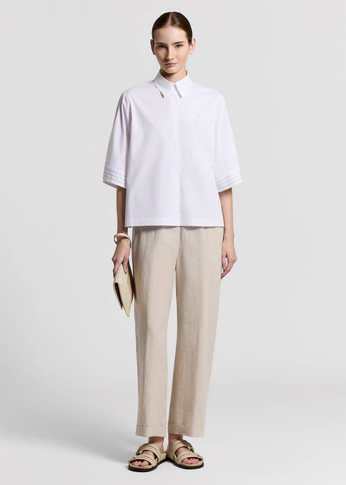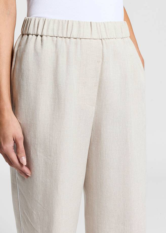 Šviesios spalvos vasariškos lino audinio kelnės. Laisvas siluetas. Vidutinis elastinis juosmuo. Kišenės. Dekoruotos blizgia jusotele.