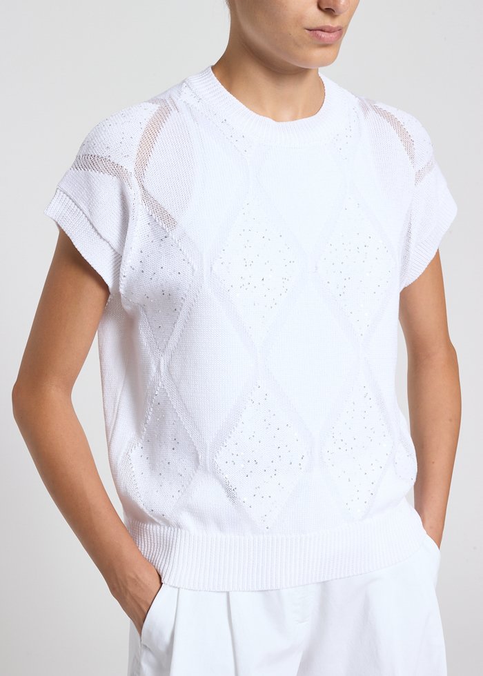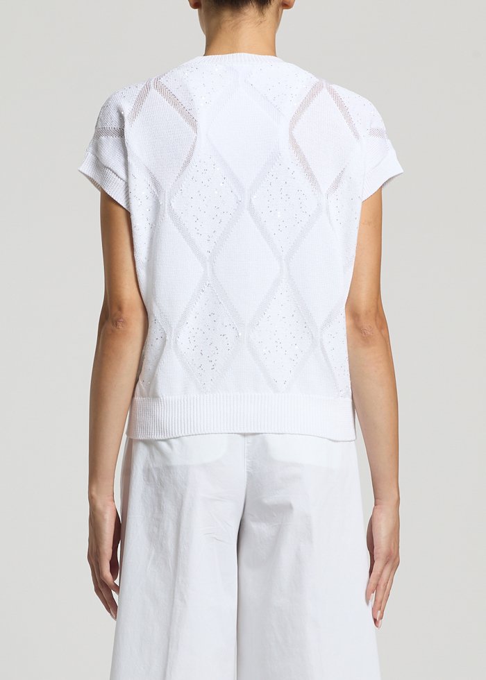 Baltos spalvos elegantiškas megztinis trumpomis rankovėmis. Apvali kaklo iškirptė. Lengvai laisvas siluetas.