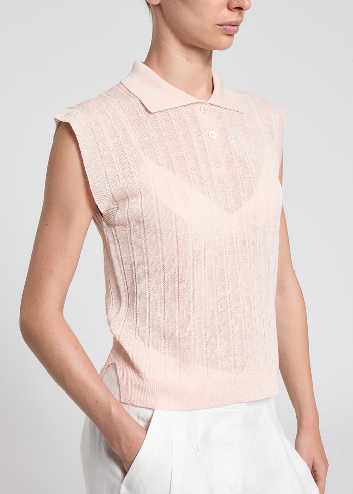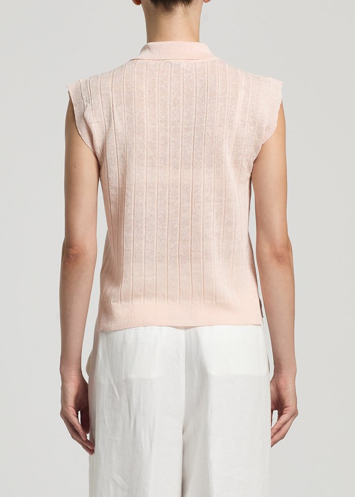 Šviesios spalvos elegantiškas megztinis trumpomis rankovėmis. Klasikinė apykaklė.