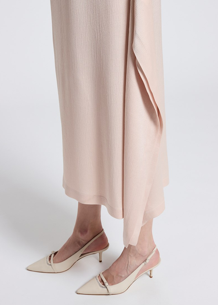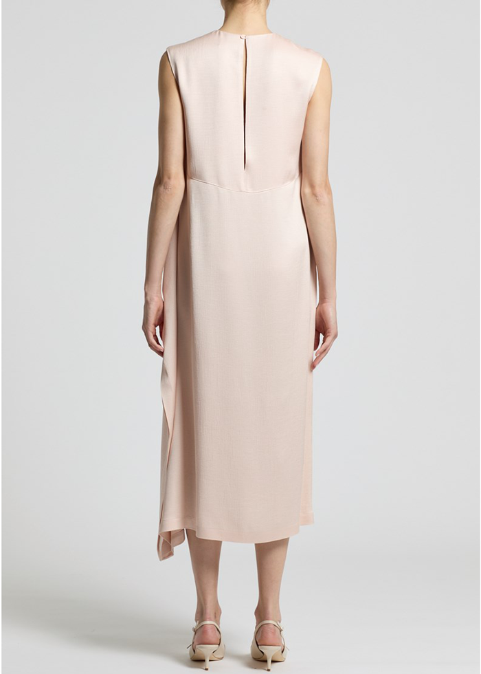 Švelnios rožinės spalvos midi ilgio suknelė be rankovių. Apvali kaklo iškirptė. Puošni skelto detalė.