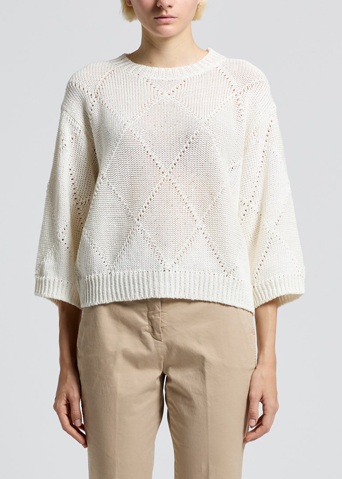 Įmegztas rombų raštas su perforuotomis detalėmis kuria išraiškingą, trimatį paviršių ir išryškina natūralią melanžo struktūrą.