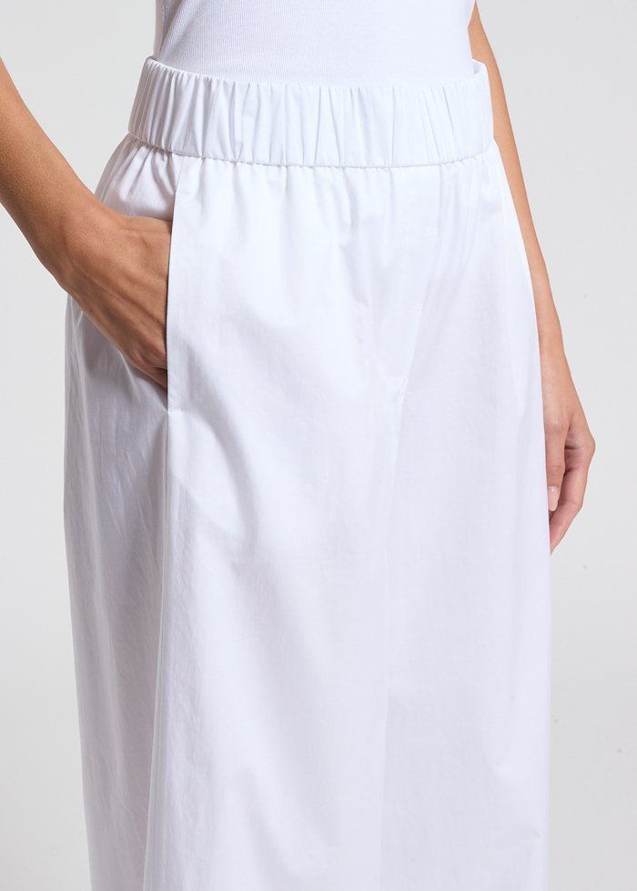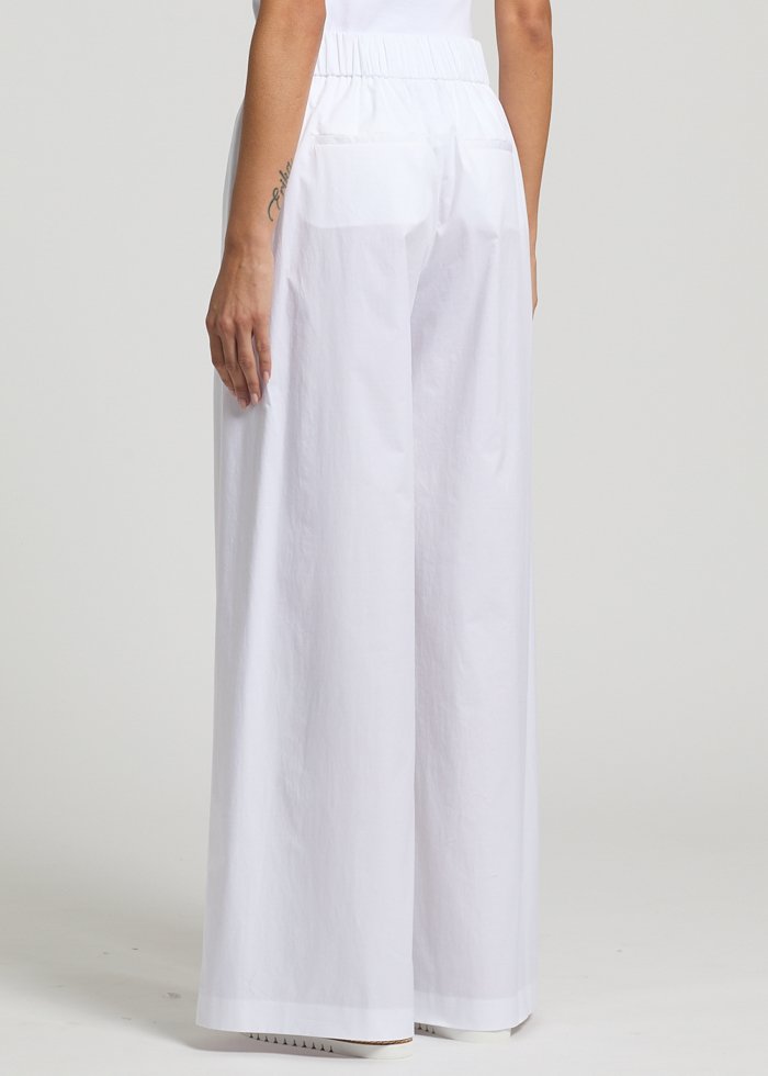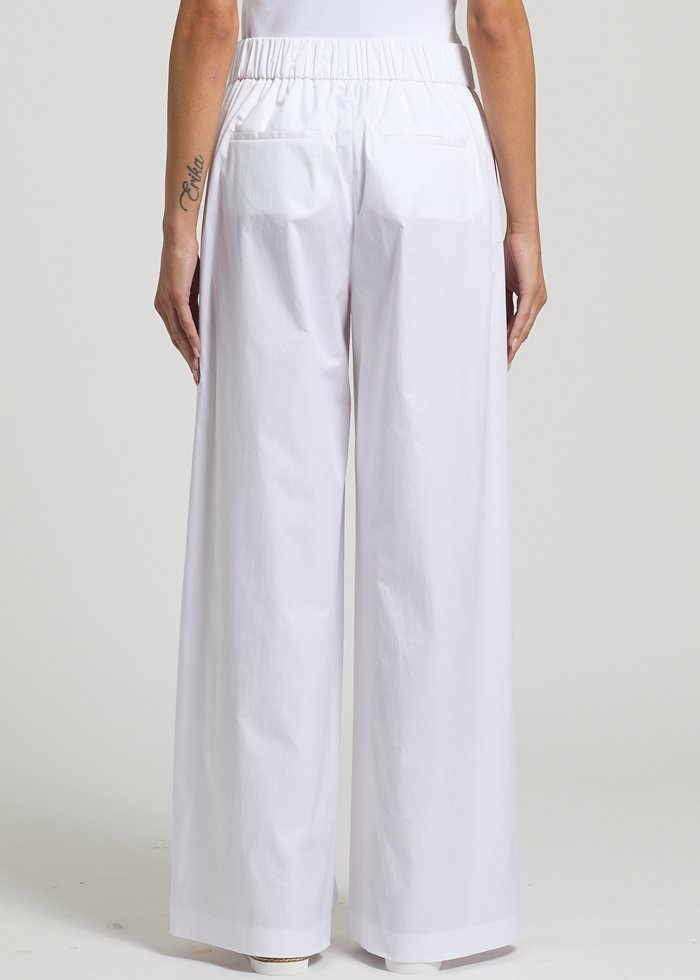 Baltos spalvos laisvo silueto kelnės. Vidutinis elastinis juosmuo. Kišenės.