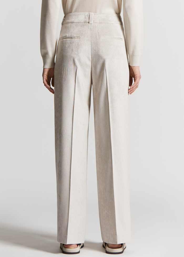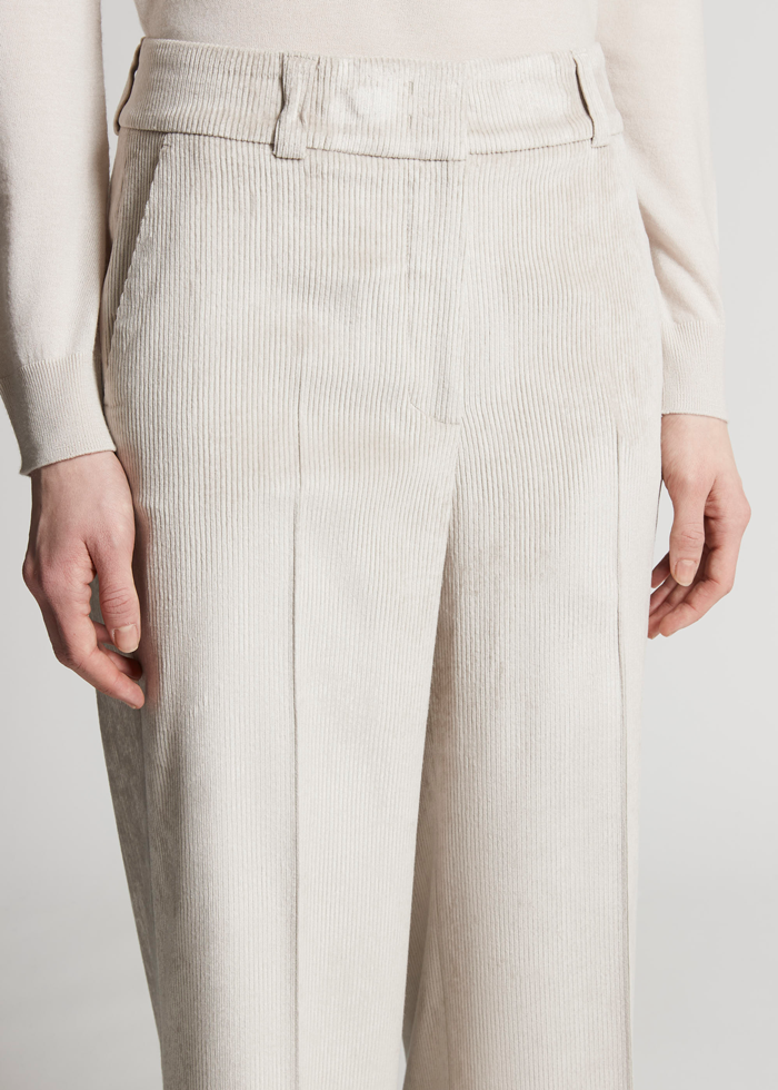 Šviesios spalvos velveto audinio tiesaus kirpimo kelnės. Vidutinis juosmuo. Kilpos diržui.