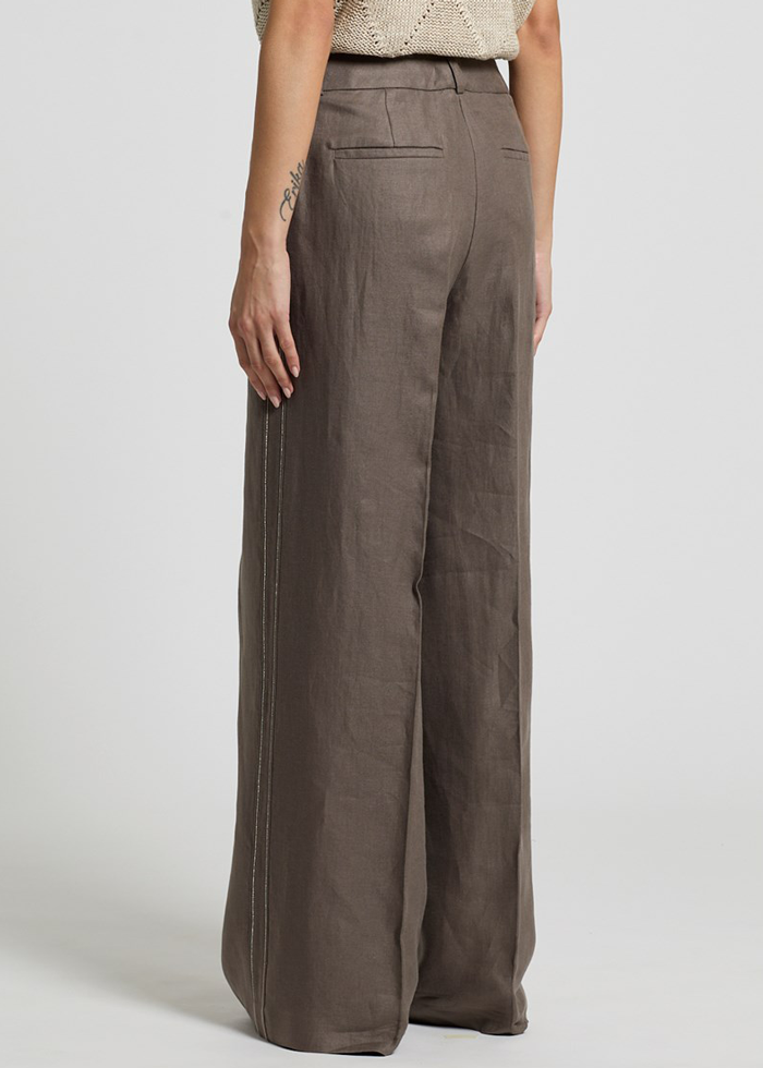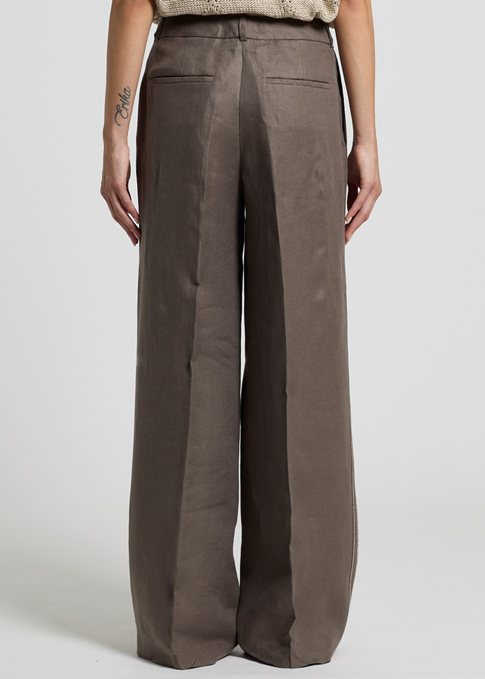 Tamsiai rudos spalvos plataus silueto kelnės. Vidutinis juosmuo. Kilpos diržui. Kišenės.