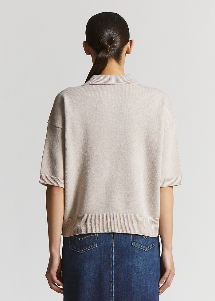 Pastelinės spalvos polo stiliaus megztinis trumpomis rankovėmis. V formos kaklo iškirptė.