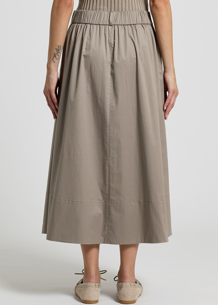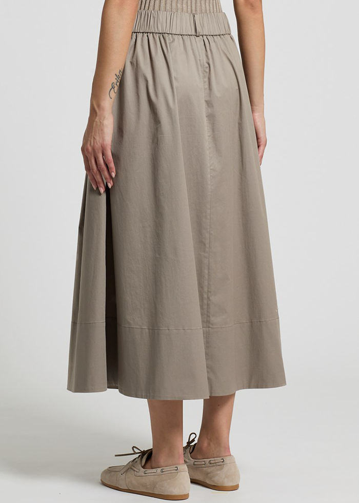 Šviesios spalvos midi ilgio A silueto elegantiškas sijonas. Vidutinis pusiau elastinis juosmuo. Kišenės.