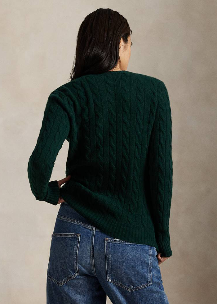 Žalios spalvos klasikinis vilnos ir kašmyro audinio megztinis ilgomis rankovėmis. Apvali kaklo iškirptė. Išsiuvinėtas ikoniškas logotipas.