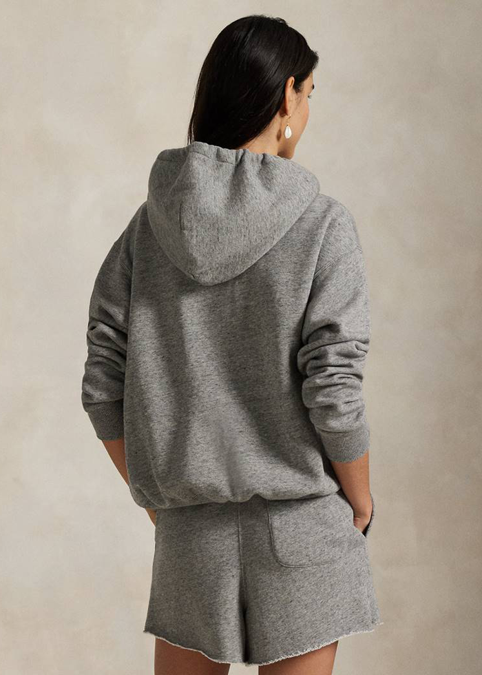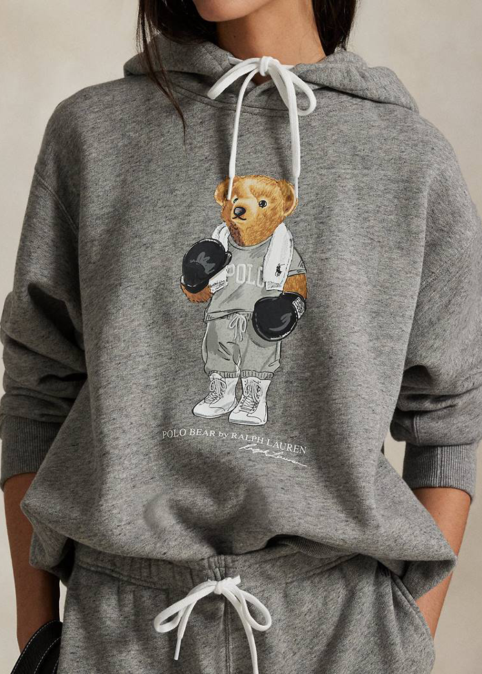 Pilkos spalvos laisvo silueto džemperis ilgomis rankovėmis su ikoniška “Polo Bear by Ralph Lauren” aplikacija. Apvali kaklo iškirptė. Reguliuojamas raišteliu gobtuvas.