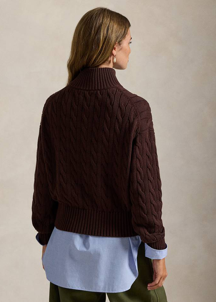 Tamsiai rudos spalvos megztinis ilgomis rankovėmis. Užsegamas užtrauktuku. Nuleista pečių linija.
