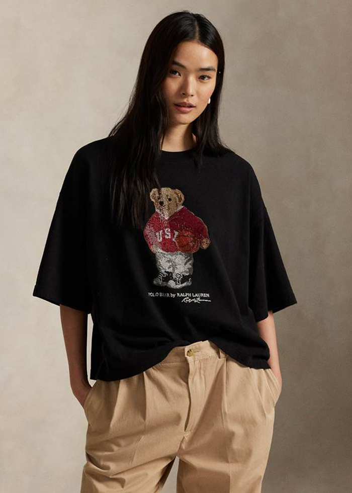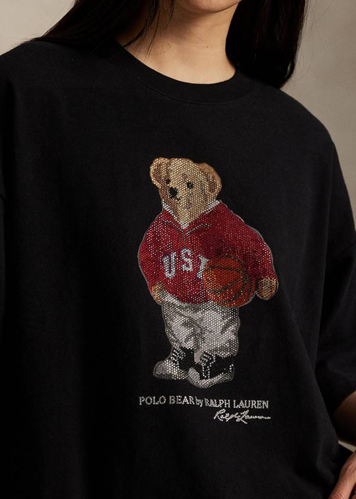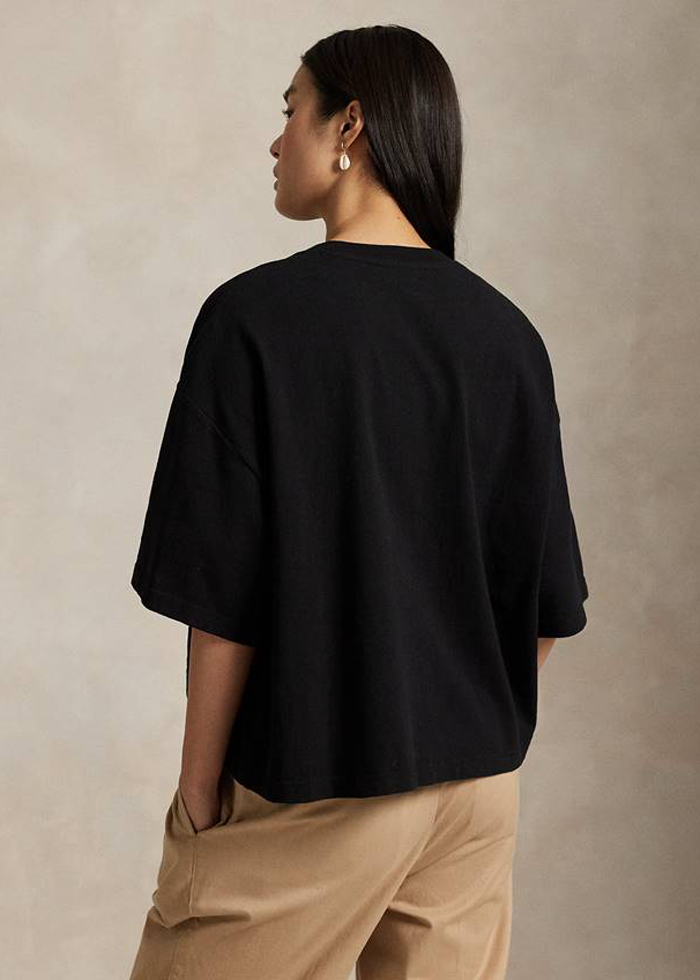 Juodos spalvos standžios medvilnės oversize silueto marškinėliai trumpomis rankovėmis. Apvali kaklo iškirptė. Ikoniškas “Polo Bear by Ralph Lauren”.