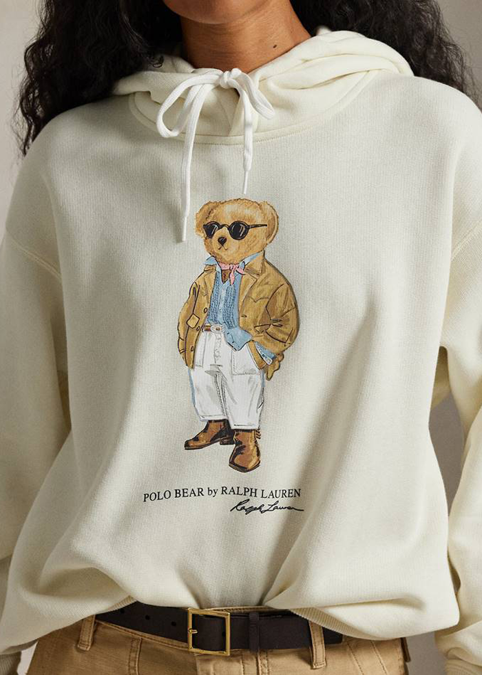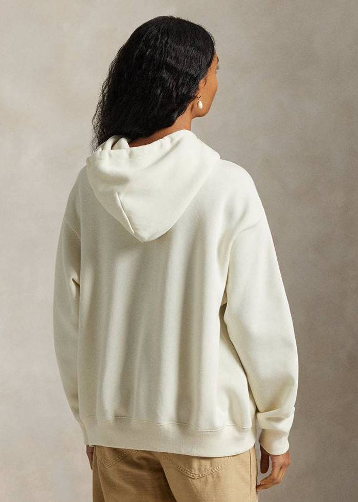 Kreminės spalvos laisvo silueto džemperis ilgomis rankovėmis su ikoniška “Polo Bear by Ralph Lauren” aplikacija. Apvali kaklo iškirptė. Reguliuojamas raišteliu gobtuvas.