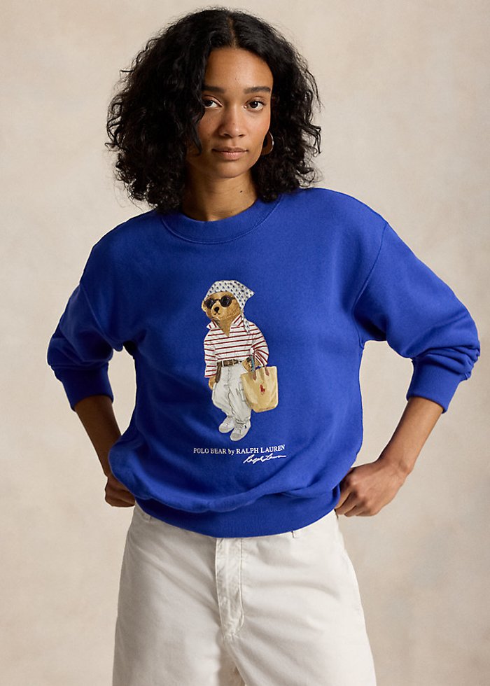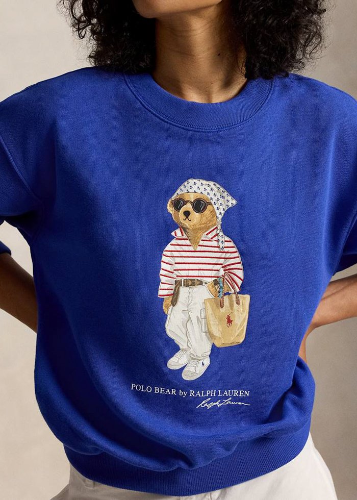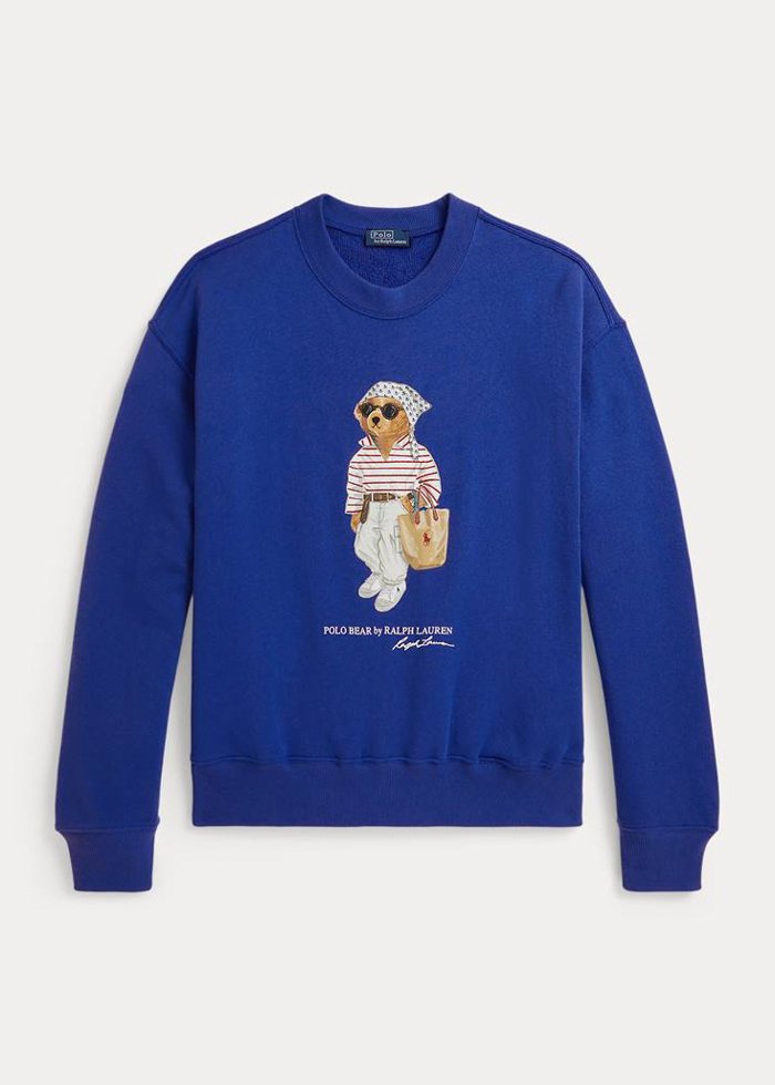 Mėlynos spalvos laisvo silueto džemperis ilgomis rankovėmis su ikoniška “Polo Bear by Ralph Lauren” aplikacija. Apvali kaklo iškirptė.