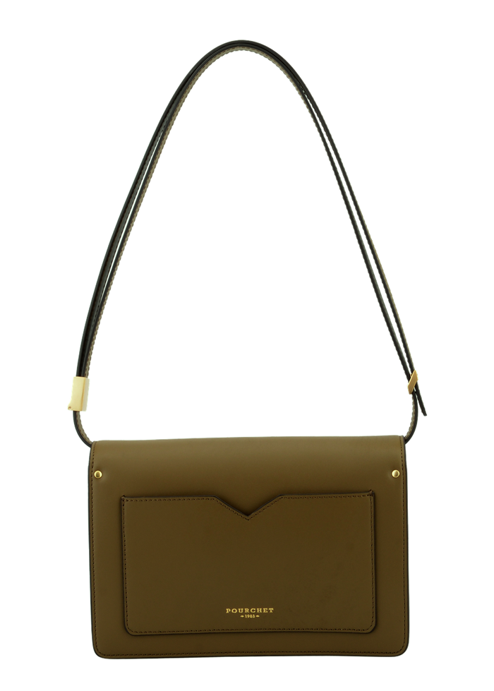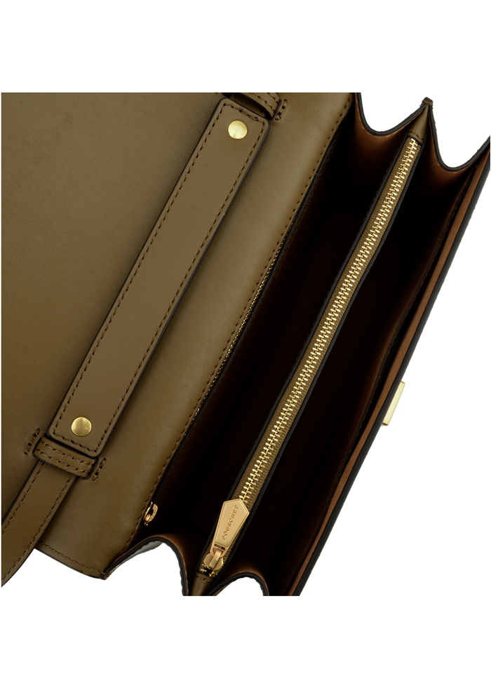 Chaki spalvos lygios odos ,,Anjou” rankinė. Ausko spalvos furnitūra. Su atvartu. Reguliuojama perpetinė rankena.