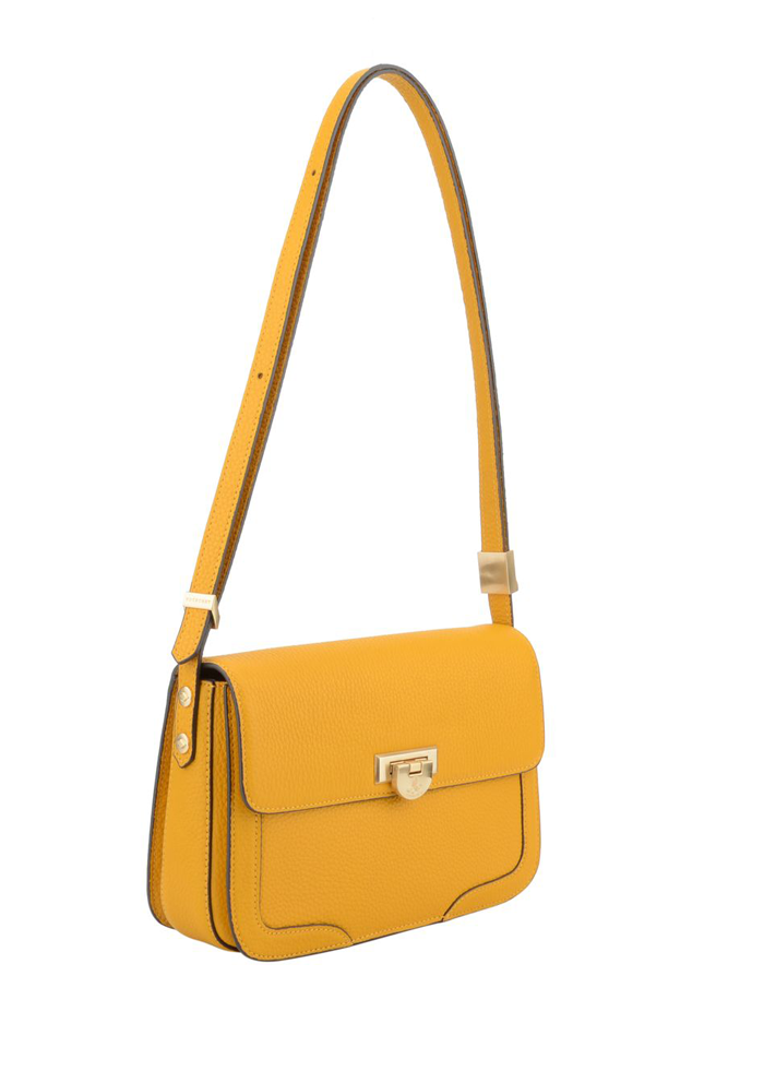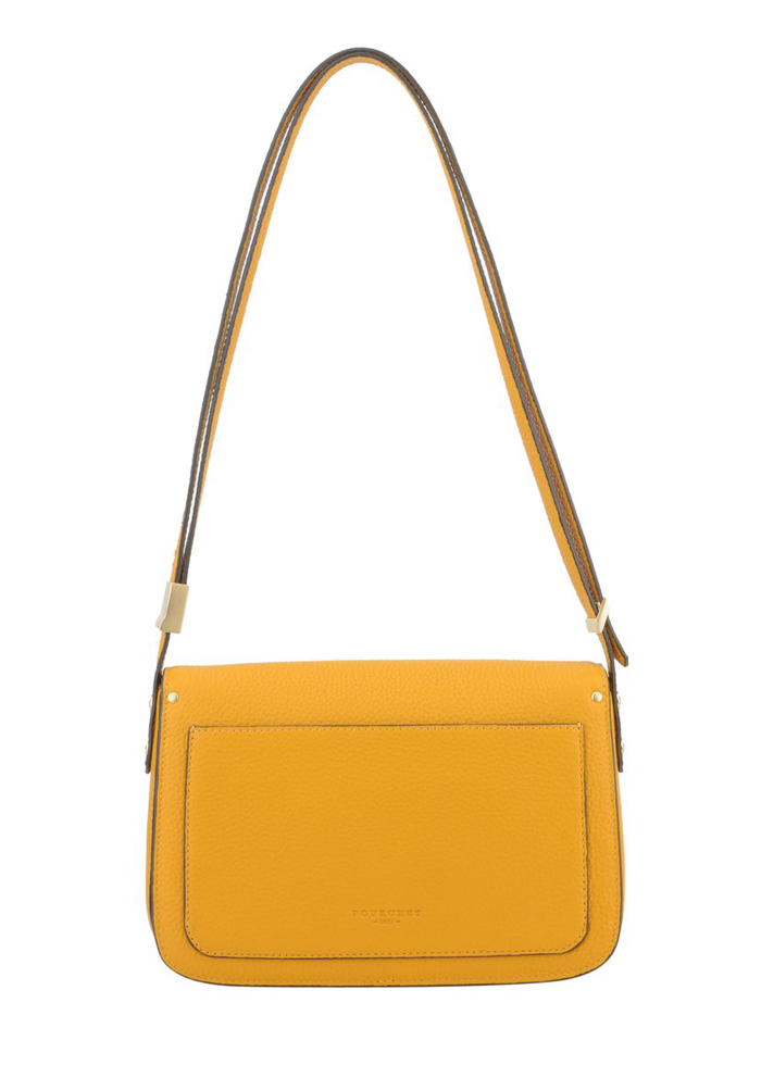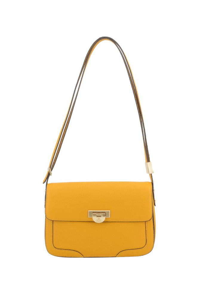 Ryškios geltonos spalvos odinė ,,Auteuil” rankinė. Perpetinė ilga rankena. Užsegama sagtimi. Aukso spalvos furnitūra.
