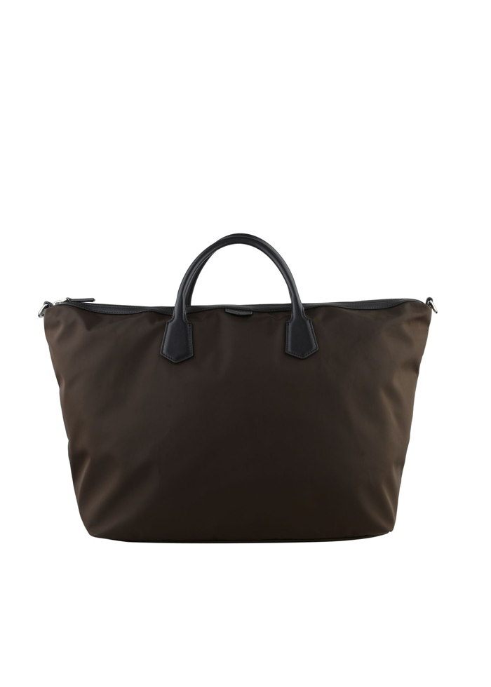 Tamsiai rudos spalvos talpus kelioninis krepšys. Užsegamas užtrauktuku. Ilga perpetinė rankena.