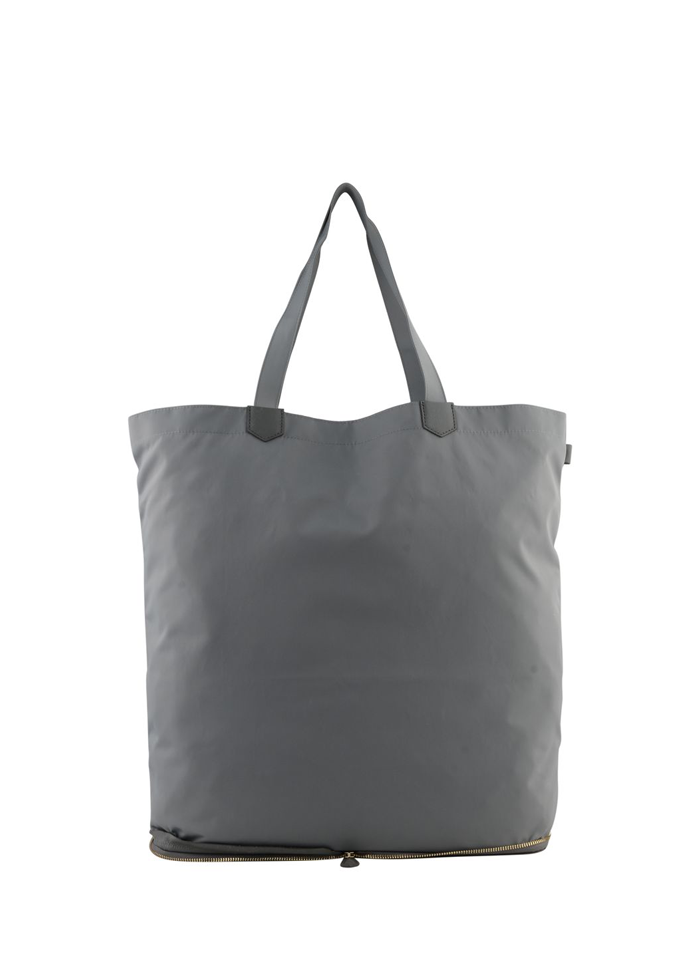 Pilkos spalvos talpus kelioninis krepšys. Susisega į mažą kompaktišką dėklą.