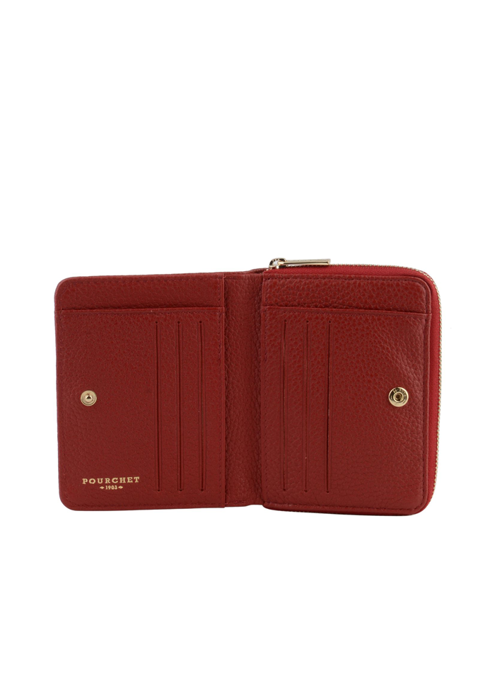 Raudonos spalvos odinė piniginė. Užsegama spaude. Skyrius su užtrauktuku.