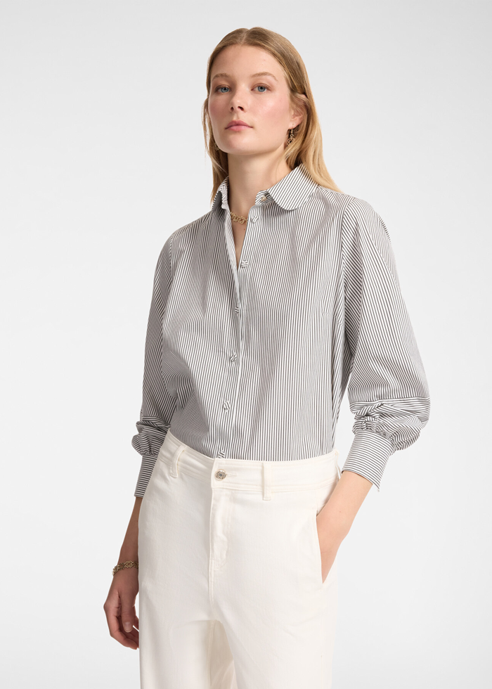 Mėlynos spalvos dryžuoti oversize silueto marškiniai ilgomis rankovėmis. Nuleista pečių juosta. Skeltai šonuose. Užsegami sagomis.