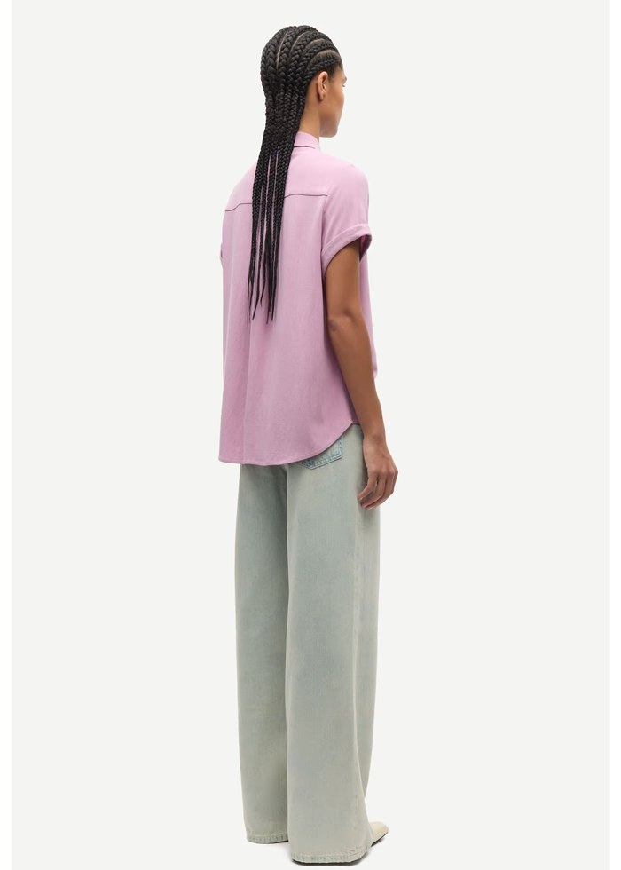 Rožinės spalvos laisvo silueto palaidinė trumpomis rankovėmis. Užsegama sagutėmis. Klasikinė apykaklė.