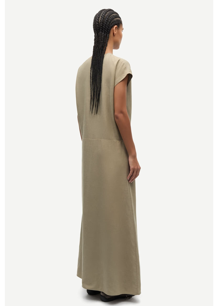 Trumpomis rankovėmis austas maksi ilgio suknelės modelis su klasikiniu siluetu ir A formos sijonu. Šonuose – raukimo detalės ties juosmeniu, apvali iškirptė su priekiniu skeltuku. Nugara uždara.