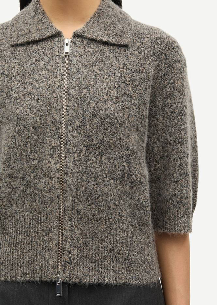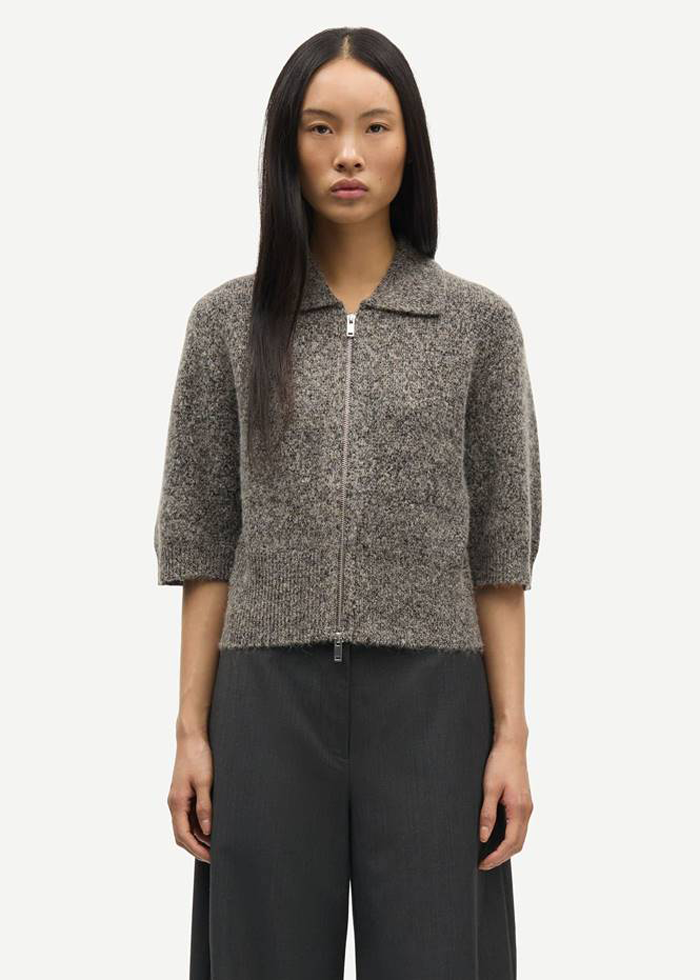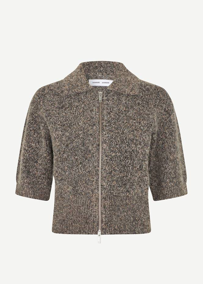 Rusvai pilkšvos spalvos kardiganas trumpomis rankovėmis. Atlenkiama apykaklė. Užsegamas užtrauktuku.